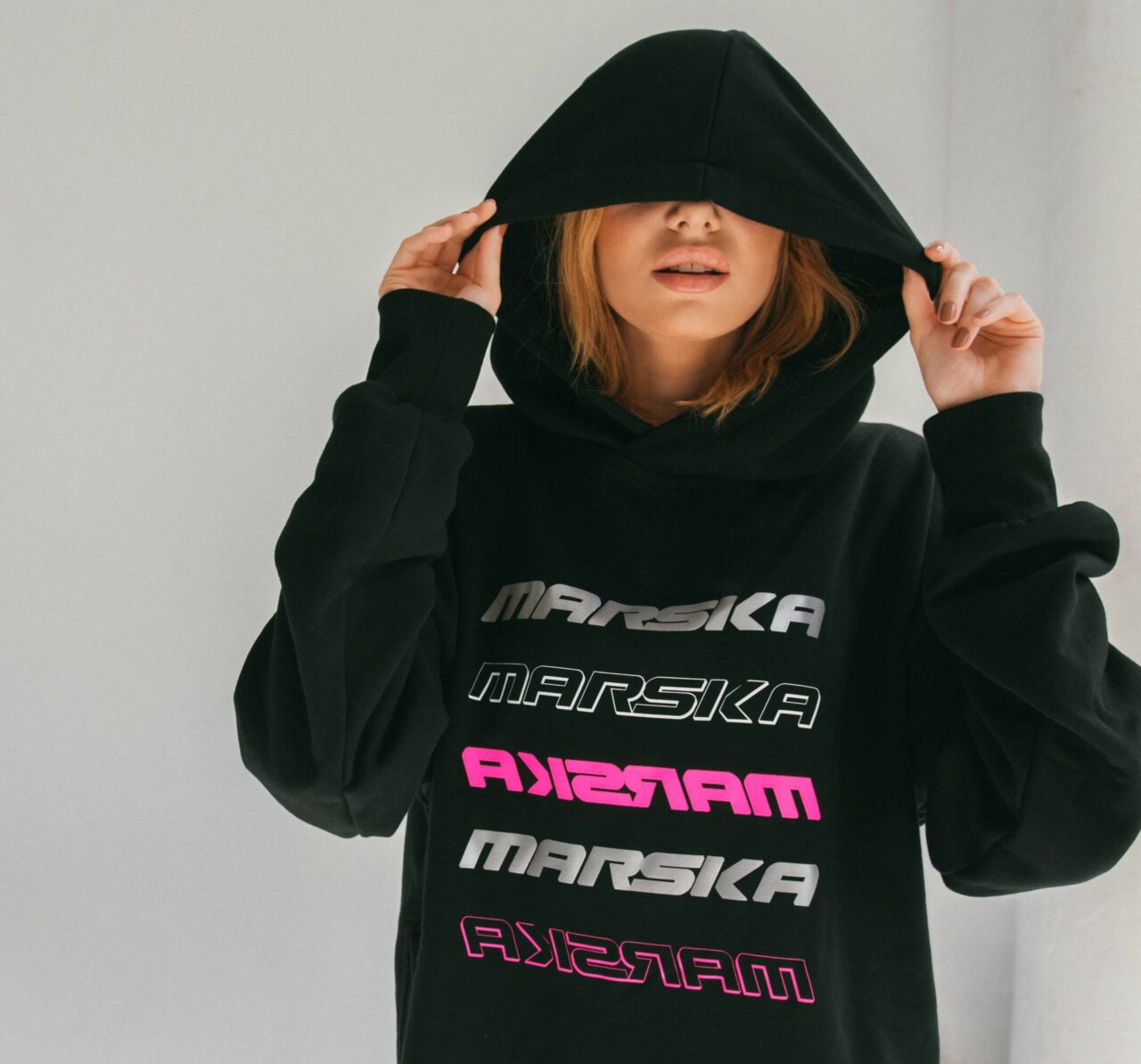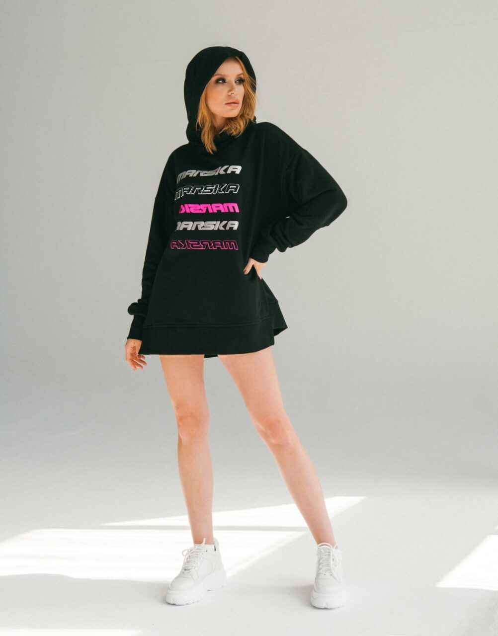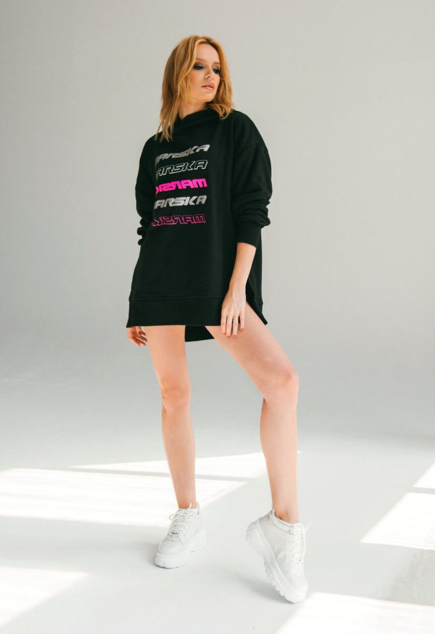 Czarna owersajzowa bluza z kapturem.
