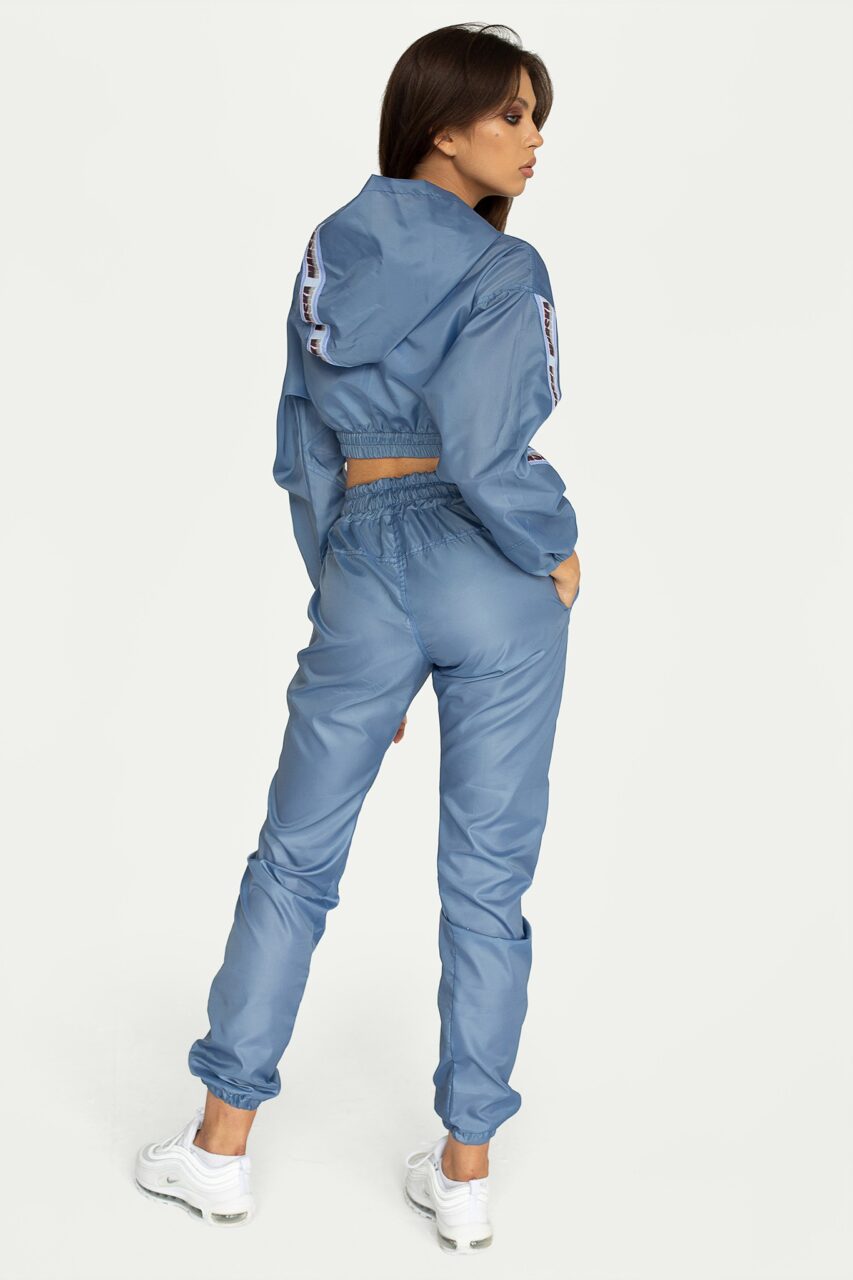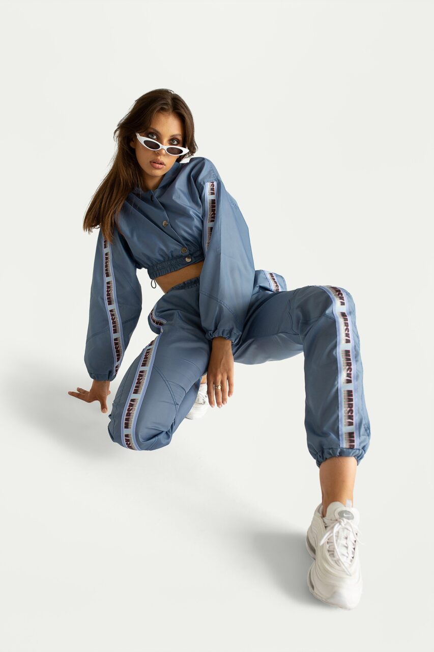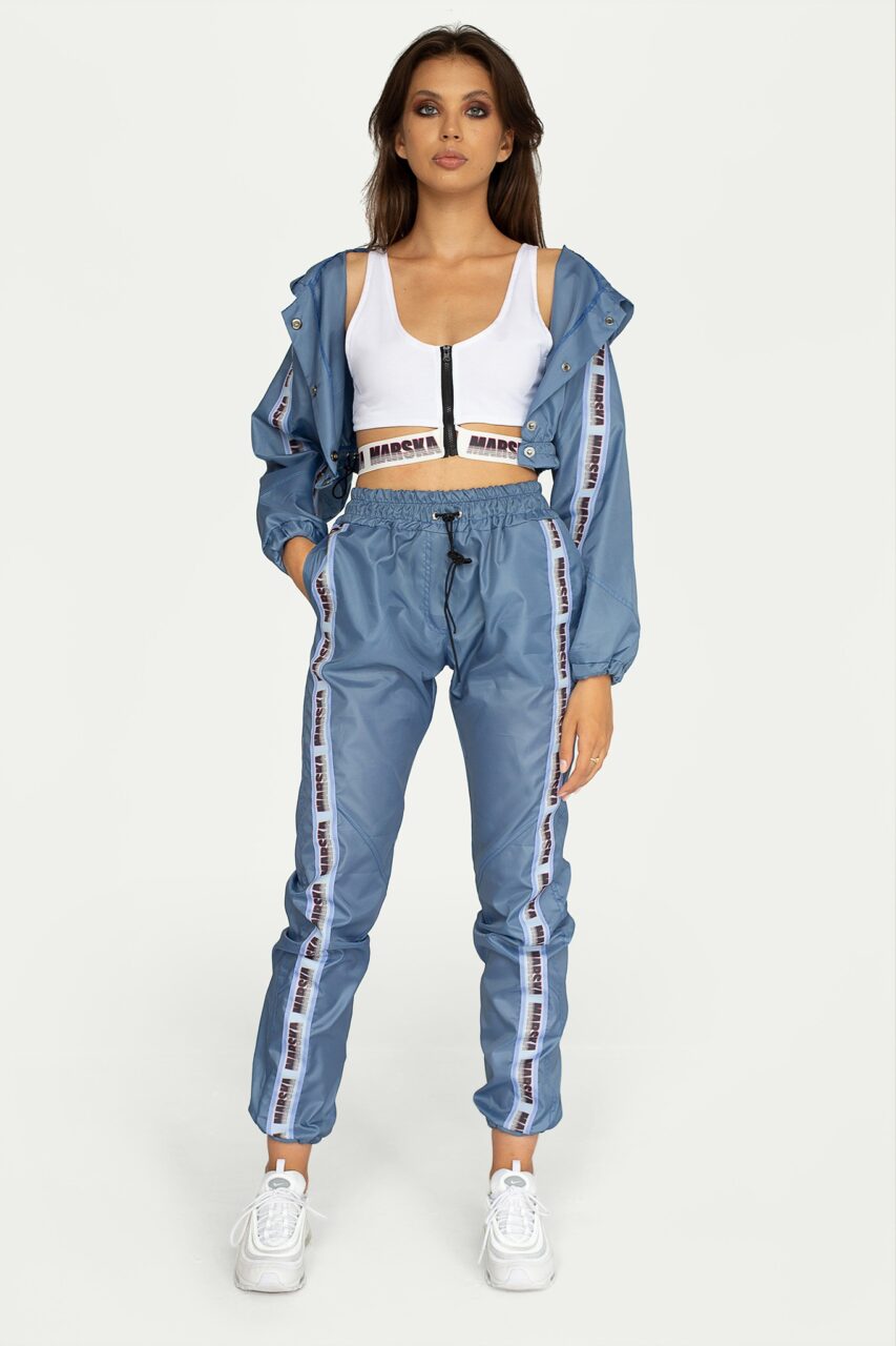 Spodnie ortalionowe w niespotykanym szaro-niebieskim kolorze.